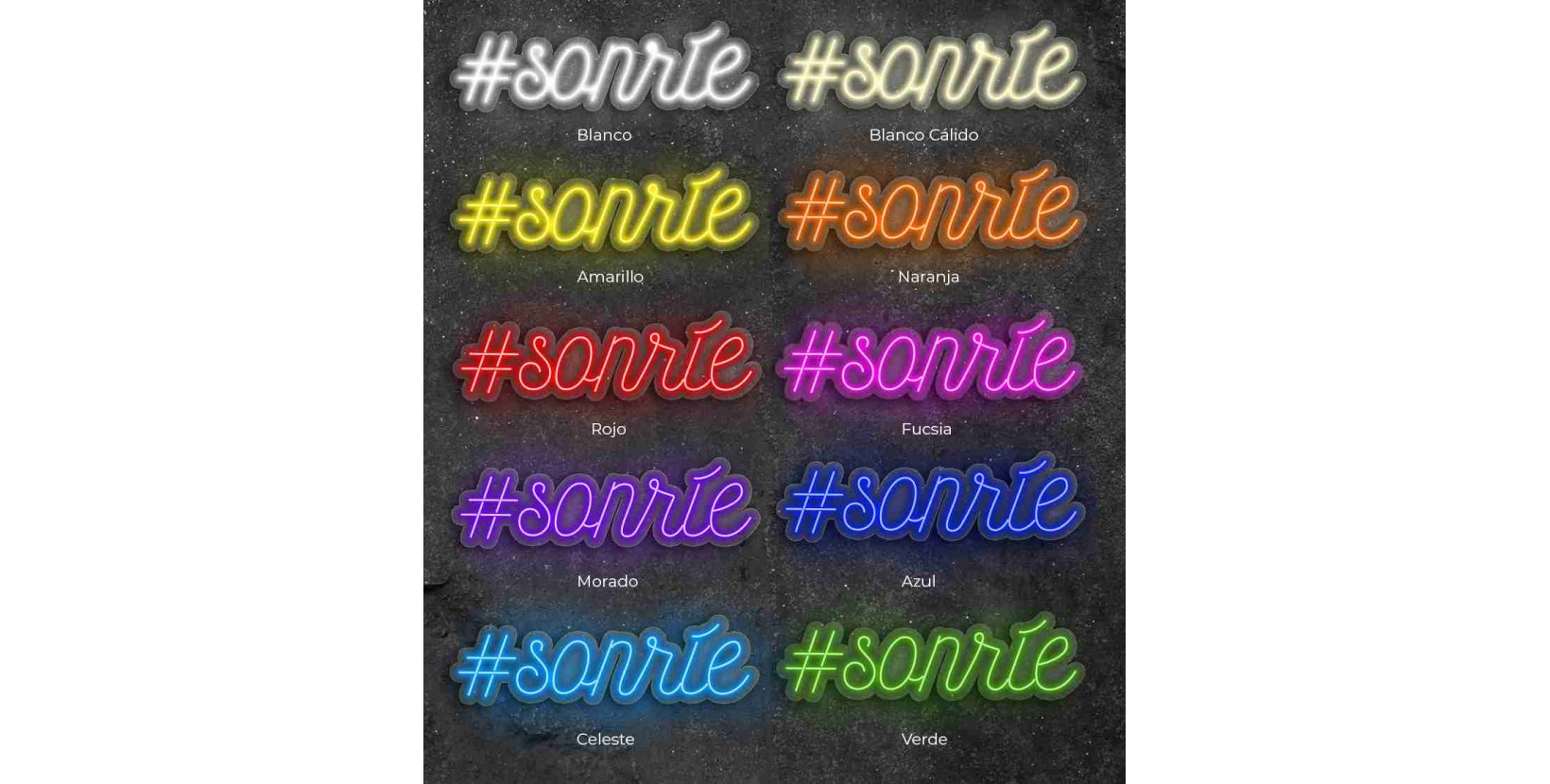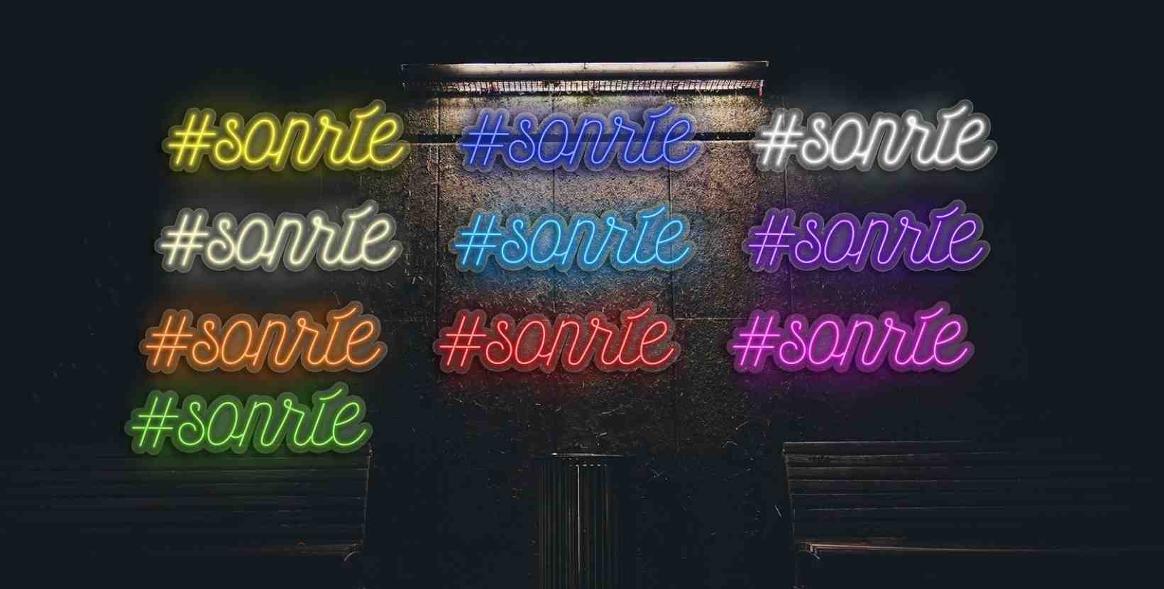 Elige tu neón #Sonríe en el color que más te guste: amarillo, azul, blanco, blanco cálido, celeste, fucsia, morado, naranja, rojo o verde y en cualquiera de sus dos tamaños.