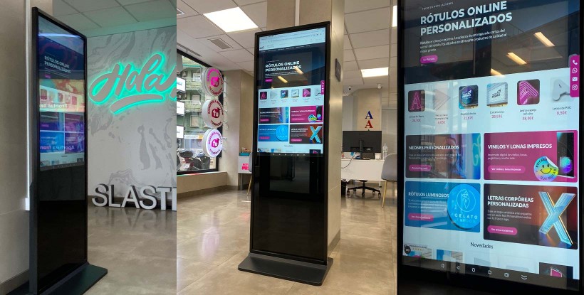 Pantalla de 43 o 55 Pulgadas. Medidas 18cm grueso x 180cm altura, 80cm de ancho e iluminación 350cd/m2. La mejor opción calidad precio para escaparates de interior.