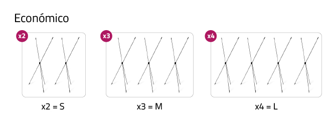 Para identificarlos fácilmente, el photocall económico si tienes 2 estructuras en forma de “X” corresponde al tamaño S. Si tienes 3 estructuras es el tamaño M y si tienes 4 estructuras sería el tamaño L.