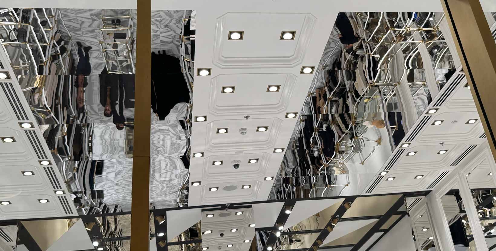 Debido a la ligereza del metacrilato, se pueden substituir rápidamente las piezas de escayola o fibra del techo por nuestras piezas de espejo. Transformando de forma rápida un techo de talla desmontable convencional.
