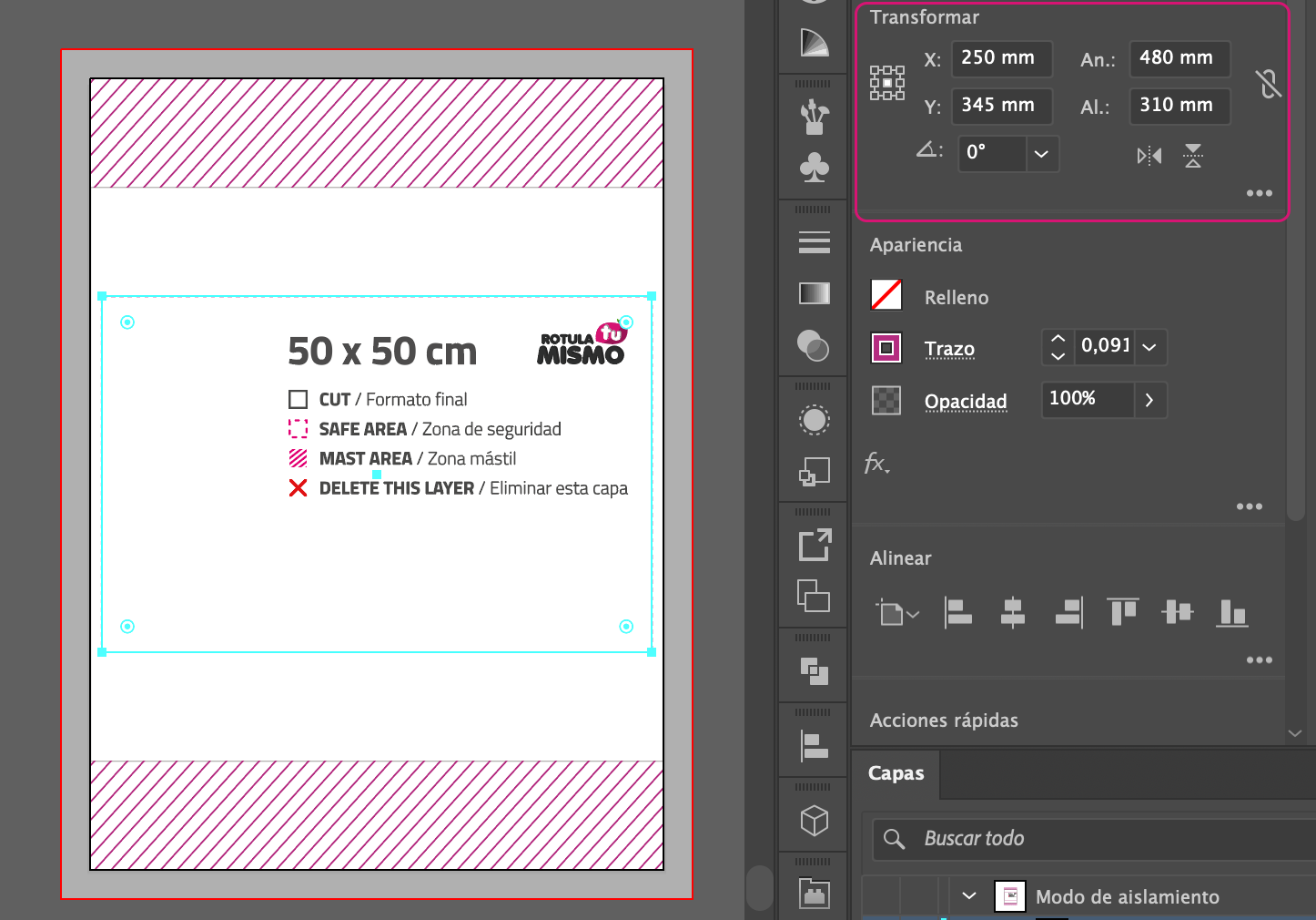 Si eliges una lona de 50 cm de alto, el archivo final tendrá una altura total de 69 cm (50 cm visibles + 9,5 cm arriba + 9,5 cm abajo).