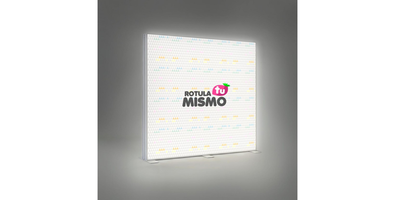 Este sistema está basado en un rótulo textil retroiluminado a doble cara, lo que permite que el diseño sea visible desde ambos lados del photocall. Esta característica lo convierte en una opción especialmente interesante para espacios abiertos, zonas de paso o stands de feria donde el público puede visualizar el soporte desde diferentes ángulos.