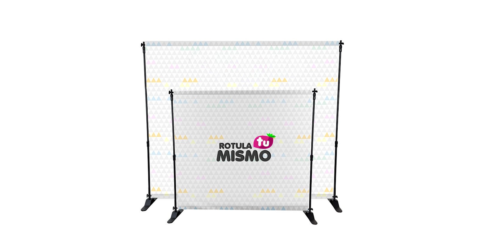 Banner extensible y ajustable impreso en tela 100% poliéster. Estructura telescópica extensible y adaptable a cualquier medida desde 185 x 100 cm hasta un máximo de ancho 318 cm x alto 261 cm.