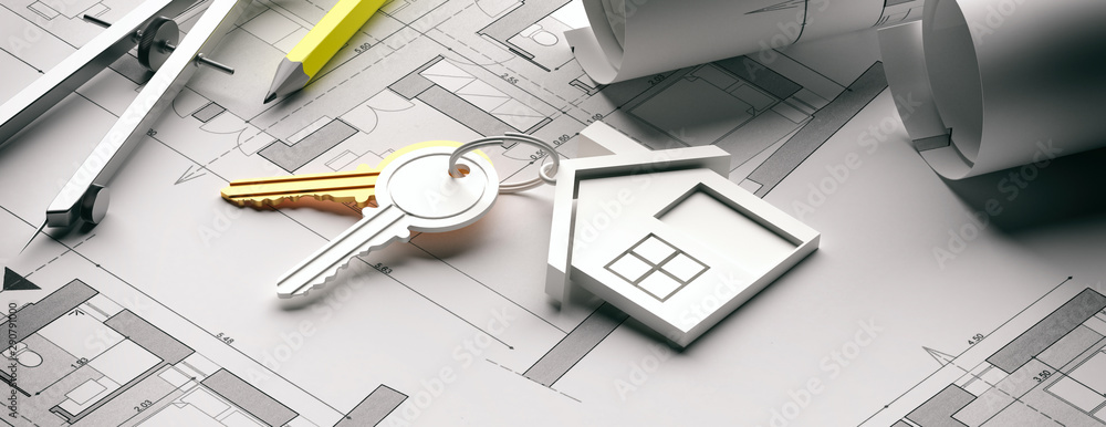 House keys and construction blueprint plans, banner. Residential development project. 3d illustration #290791000