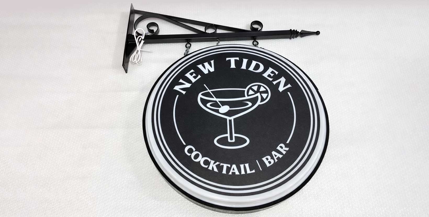 Nuestra banderola luminosa redonda colgante para bares está fabricada con productos de máxima calidad. Se entrega rotulada y lista para montar.