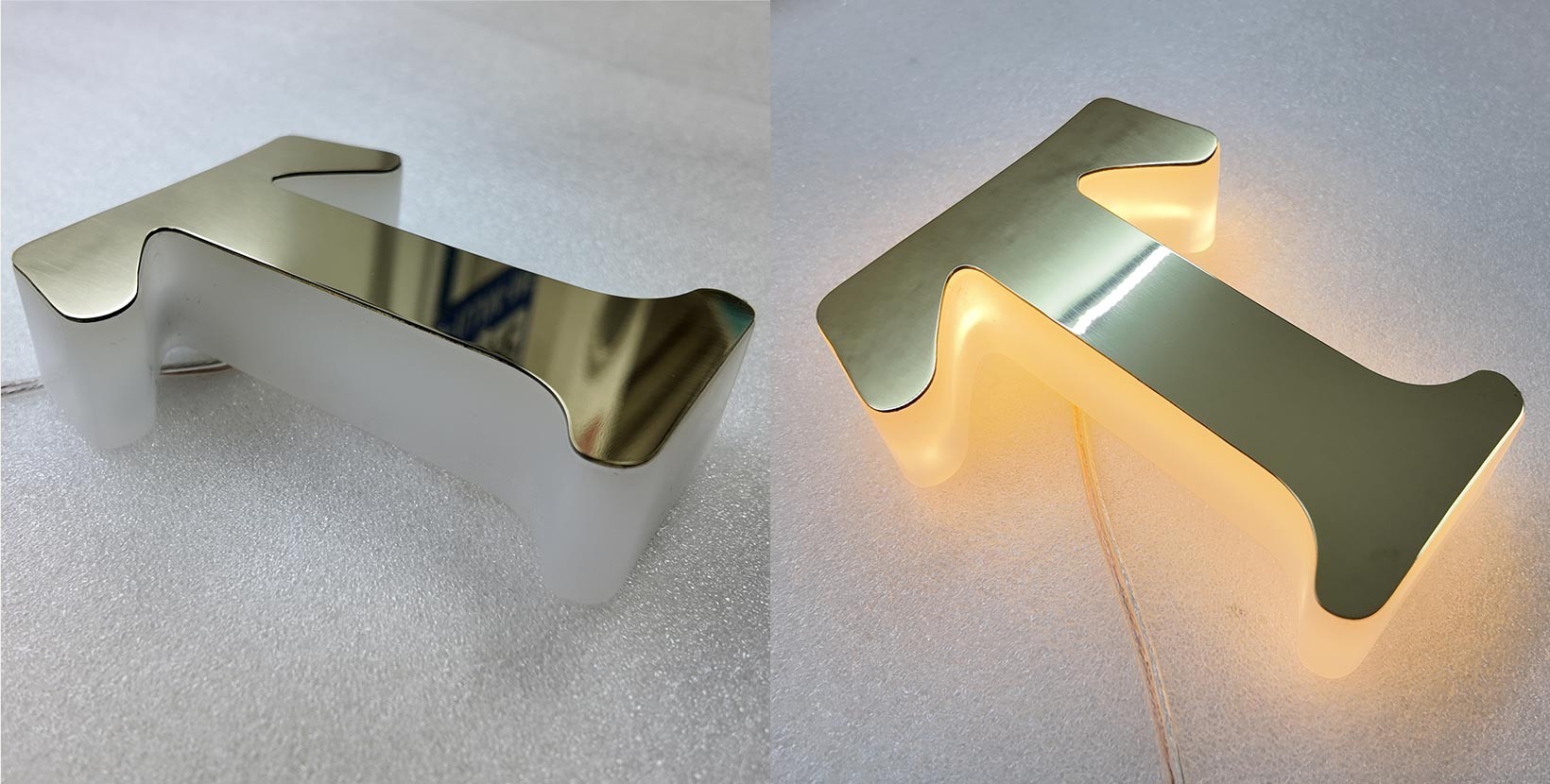Letras de dibond satinado color oro + metacrilato iluminado. Hemos...