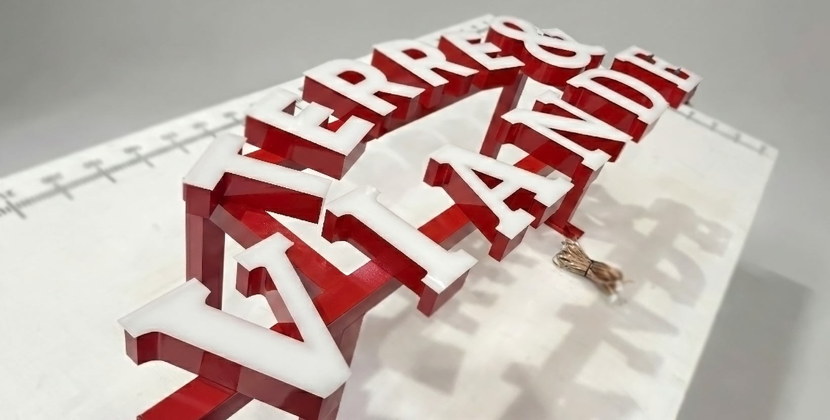 Letras con trazos iluminados de 10mm. Letras tan pequeñas que miden menos de 5cm de altura. No es necesario hacerlas más gruesas para hacer logos en tamaño mini. (Para este tamaño se hacen en impresión 3D no aluminio).