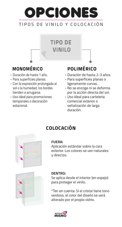 Si el vinilo va al exterior el vinilo recomendado es el polimérico que tiene una duración aproximada de entre 3 y 5 años dependiendo de las condiciones climatológicas. El sol intenso o los cambios extremos de temperaturas, son grandes enemigos del vinilo y el monomérico sufre un encogimiento severo cuando supera los 3 - 6 meses expuesto a sol directo.