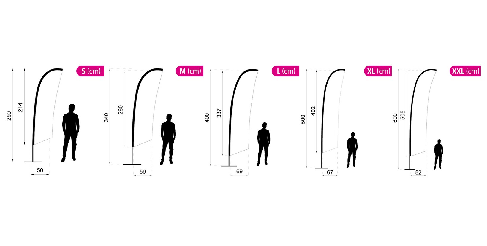 S - 290cm | M - 340cm | L - 400cm | XL - 500cm | XXL - 600cm