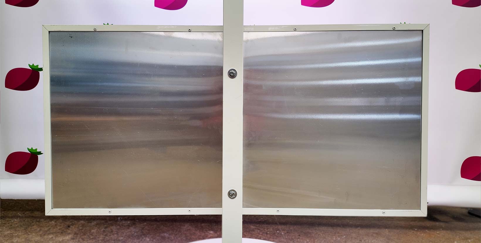 El frontal está hecho de composite de aluminio (Dibond, Alocubond, Lyxbond, etc.) y los perfiles son de metacrilato, combinando durabilidad con una estética moderna y luminosa.