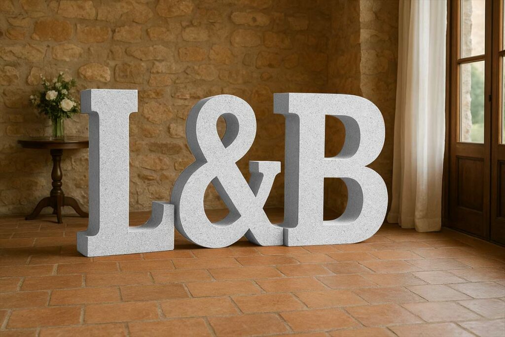 Los photocalls ya no solo llevan nombres: cuentan historias. Fechas grabadas, símbolos, frases de películas o incluso mapas estelares del día de la boda. El objetivo: que cada foto tenga algo de ellos.