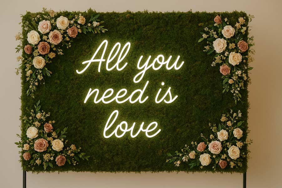 Los neones personalizados siguen reinando, pero evolucionan. Este año veremos combinaciones con letras 3D y LED ocultos, creando efectos de halo o brillo suave. Los mensajes cambian: menos “Better together”, más frases auténticas o divertidas que reflejen a la pareja.