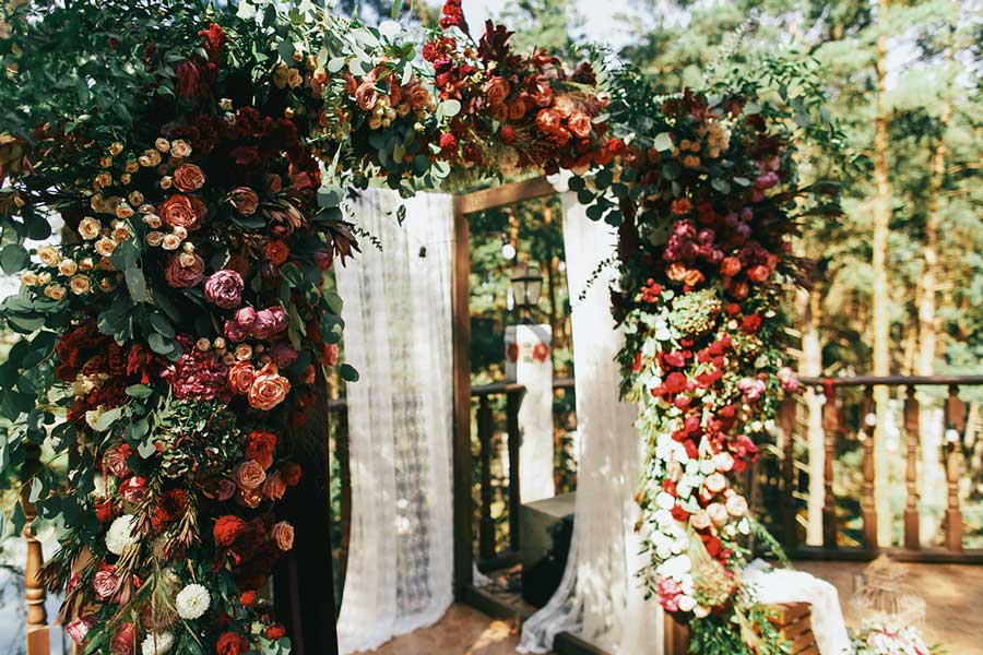 El verde sigue de moda, pero no vale cualquier hoja de plástico. Ahora se lleva lo vivo, texturizado y fresco: ramas de olivo, helechos, eucalipto y flor preservada con un toque dorado. Ideal para bodas en finca o exteriores, donde el photocall se integra en el entorno y no compite con él.