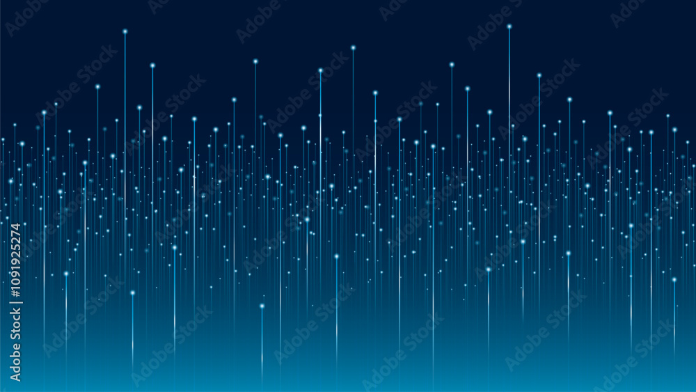 A abstract illustration with vertical lines and glowing points on a dark blue background. This futuristic illustration symbolizes science and technology, data transmission, and digital communication. #1091925274