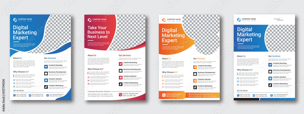 a bundle of 4 templates of different colors a4 flyer template, modern business flyer template, abstract business flyer and creative design, IT company flyer and editable vector template design #507794504