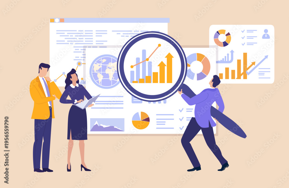 A businessman using a large magnifying glass on a projection screen to reveal information, symbolizing data analysis, investigation, research, attention to detail, and business intelligence in a corpo #1956559790