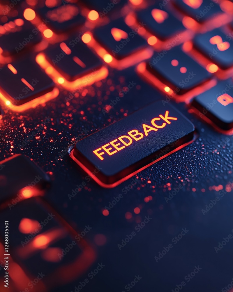 A close-up of a glowing feedback button on a dark keyboard. #1268005501