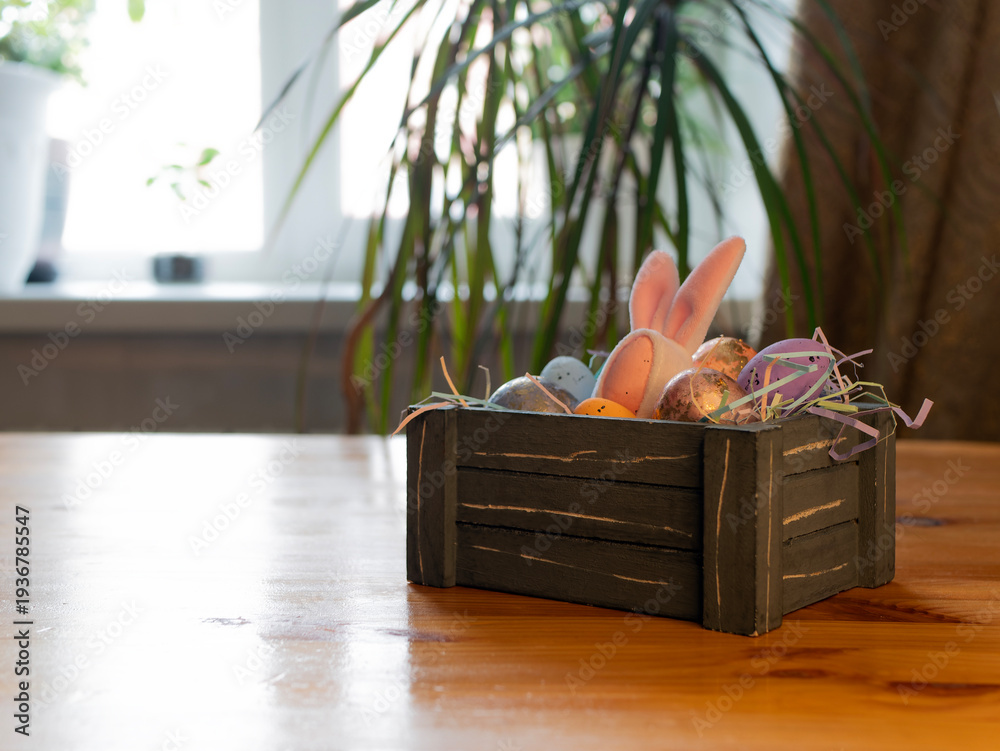 A close-up of pastel and metallic Easter eggs with soft bunny ears in a wooden crate filled with straw. A festive spring decoration, backdrop for greeting cards and banners #1936785547