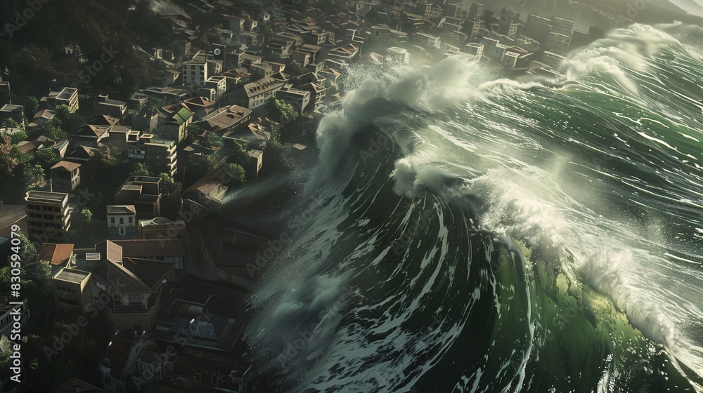 A coastal city being hit by a tsunami wave #830594079