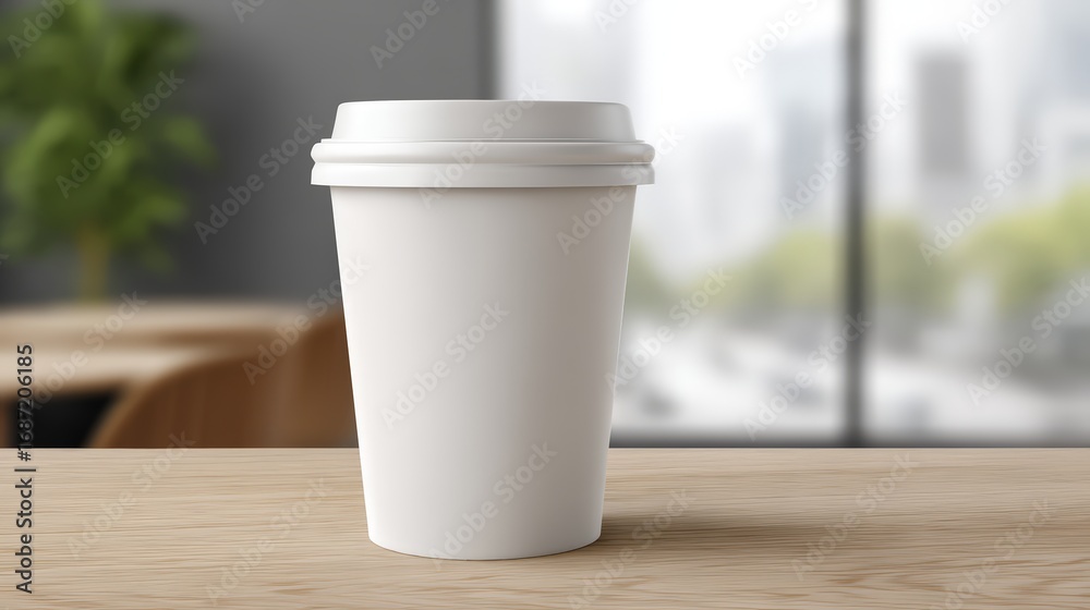 A coffee cup with a white lid on a wooden table used in coffee cafes and culinary establishments. #1687206185