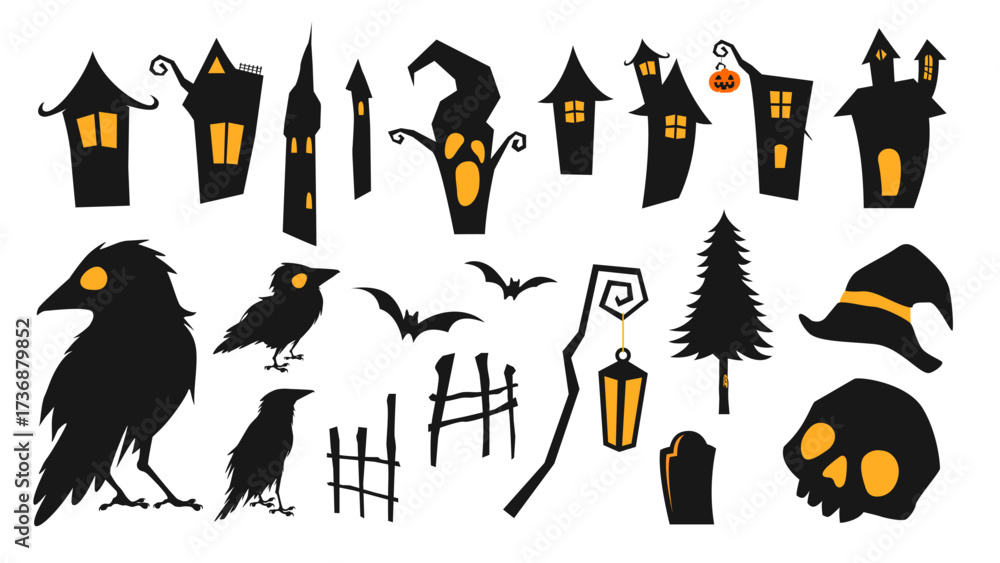 A collection of vector Halloween-themed elements including haunted houses, crows, bats, skulls, witch hats, and other spooky decorations. Cute cartoon silhouette design style. Seasonal design elements #1736879852