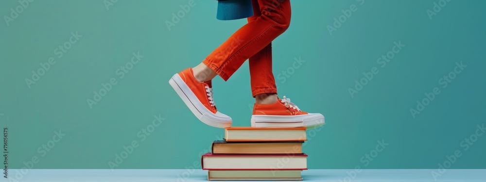 A determined student takes confident strides towards academic success, balancing their love for learning with a playful touch of red shoes on a stack of knowledge-filled books #716056575