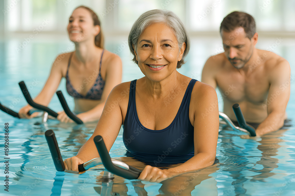 • #1592688688 A dynamic aquabike scene with three adults in a pool. In the foreground, a mature woman, smiling. Behind her, a younger woman and a man are focused on their workout.