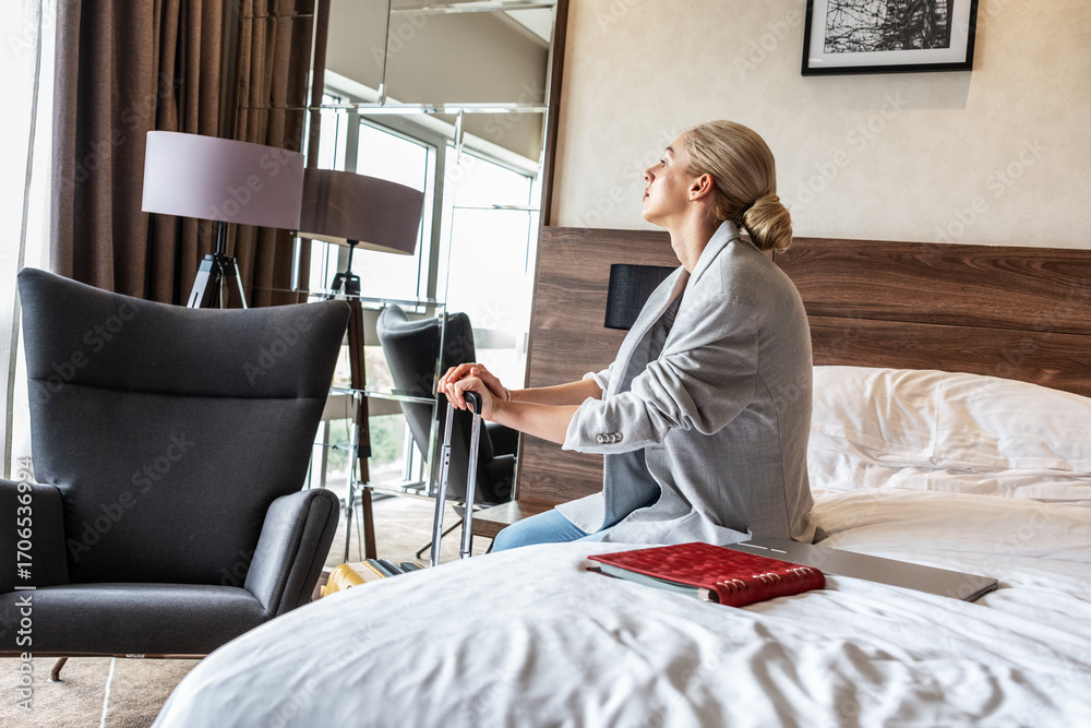 A female businesswoman arrives in her hotel room after a long conference. She sits down, looks tired, and checks her schedule for tomorrow’s meetings and tasks. #1706536994