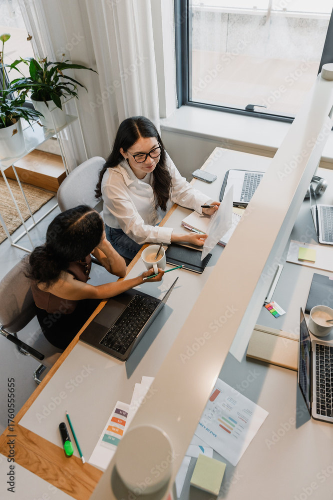 A female worker smiles and looks at the folder she is holding while sitting at a table next to a female worker #1760555655