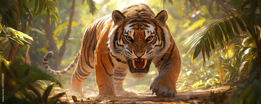 A fierce tiger prowls through a lush jungle, showcasing its majestic beauty and strength amidst vibrant green foliage. #1073704088