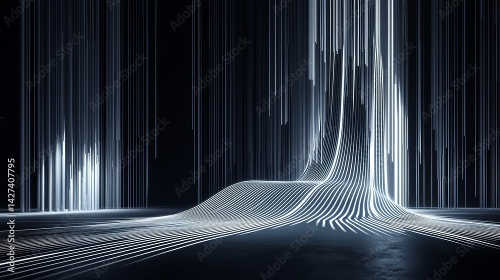 A futuristic digital landscape with flowing lines and illuminated textures. #1427407795