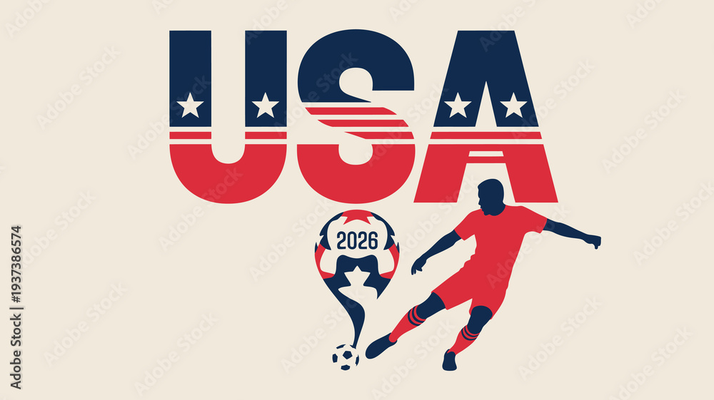 A graphic displays usa in bold lettering incorporating stars and a soccer player silhouette promoting the 2026 world cup event high quality professional detailed modern elegant #1937386574