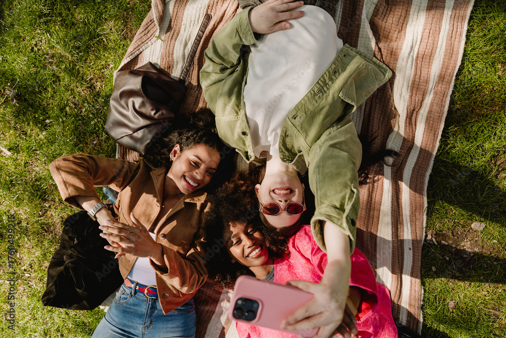 A group of three female friends are lying on a blanket and grass and smiling while posing in front of a phone that one of them is holding #1760499215