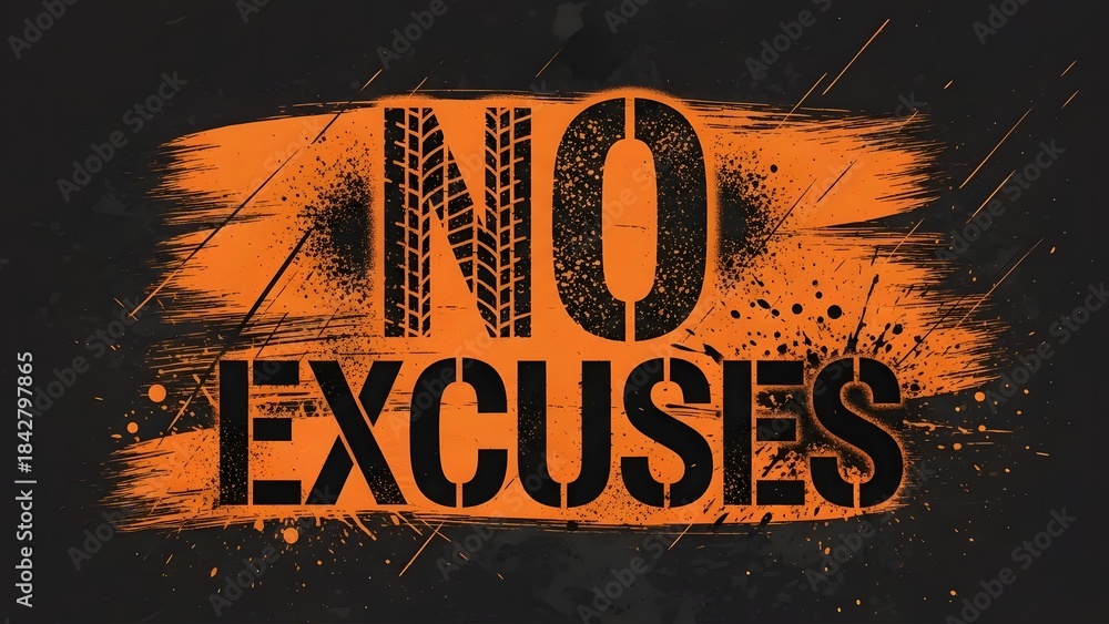 A grunge style illustration with the motivational text 'no excuses' and tire track pattern #1842797865