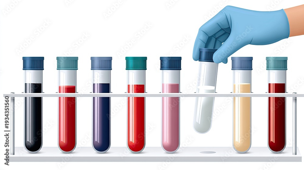 A hand in a blue glove holds a test tube filled with red liquid. Several vials with different colors are organized in the background #1934351560
