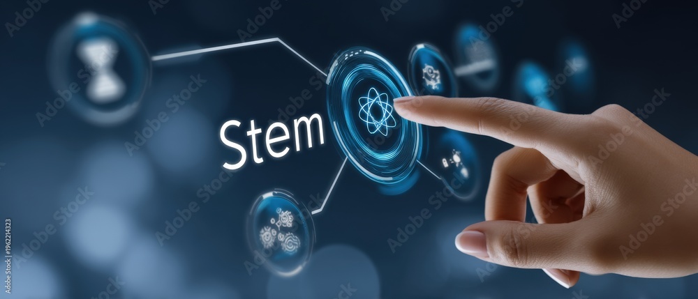 A hand touches the word stem on a screen surrounded by technology and education icons with data flowing in the background #1962214323