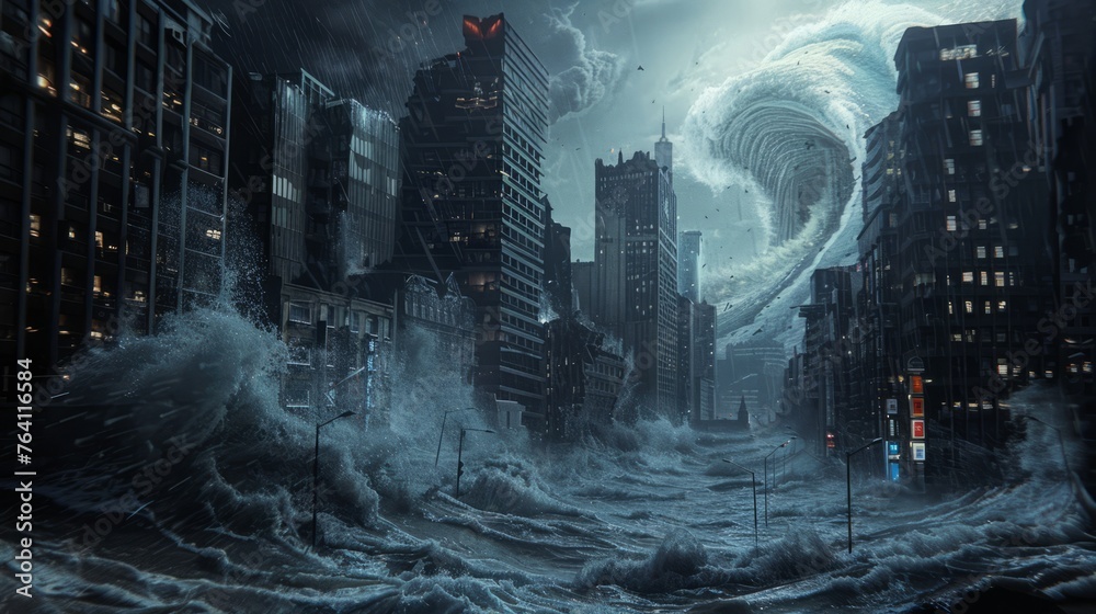 A huge tsunami wave engulfing the city #764116584