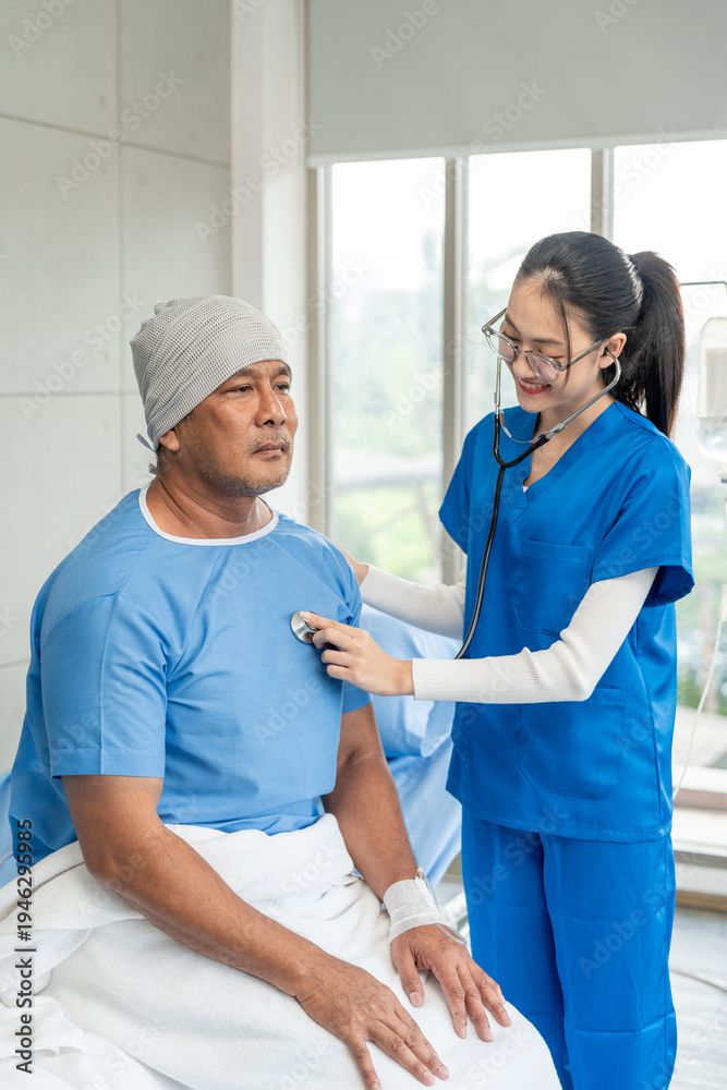 A male cancer patient on bed receives IV therapy while a female doctor offers care encouragement and updates on his test results providing support and discussing health progress #1946295985