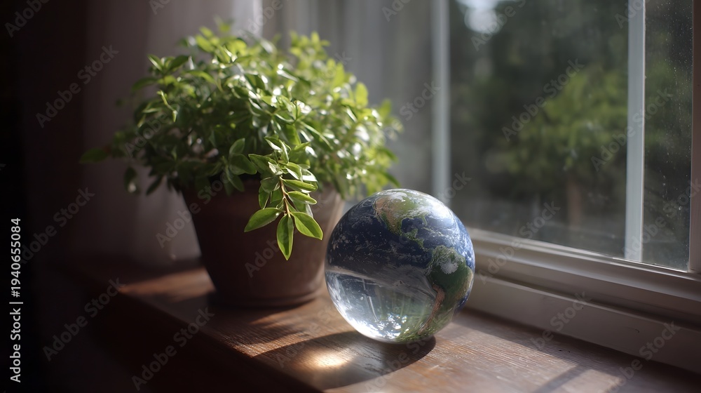 A miniature Earth globe and a green plant sit on a ill bathed in warm sunlight #1940655084