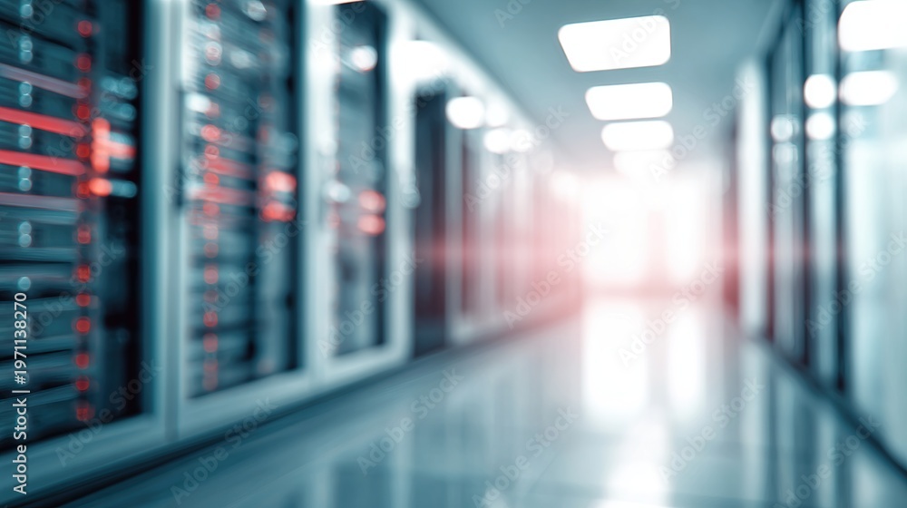 A modern, blurred data center interior with rows of server racks. A concept for technological infrastructure, a backdrop for projects in cloud computing, networking, and cybersecurity #1971138270
