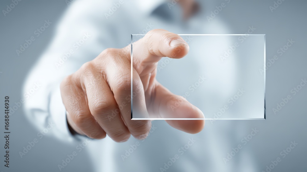 A person's hand points to a clear glass or plastic card. Including new payment methods, smart security access, digital wallets, data transport, and creative networking technologies. #1688414930