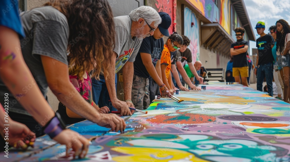 A photo showing a diverse group of individuals, young and old, working together on a large community art project, illustrating how diversity fuels creativity and collective expression. #766022350