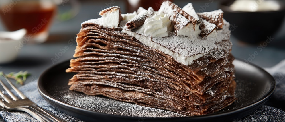 A piece of cake covered in cocoa powder sits on a dark plate. There is an open box of caramel cream nearby #1935513441