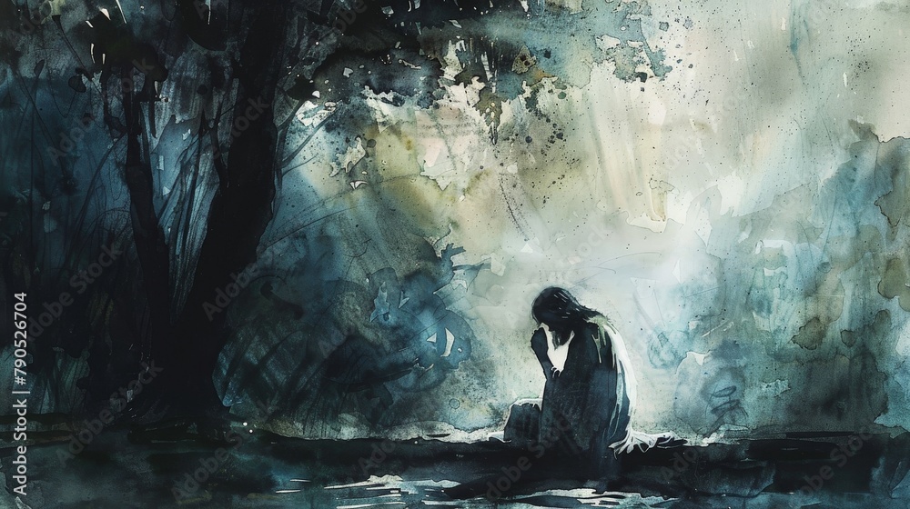 A poignant scene of Jesus praying in the Garden of Gethsemane, with dark, emotive watercolors #790526704