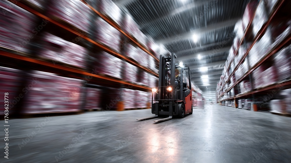 A red forklift operates in a busy motion blurred warehouse moving goods stacked high on shelves #1763623778