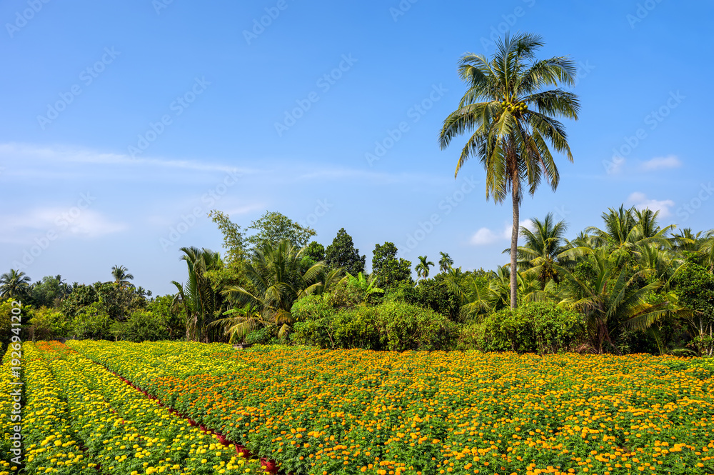 A rural landscape with fields of flowers in bloom during the New Year in Phu Son, Ben Tre province, Vietnam. #1926941202