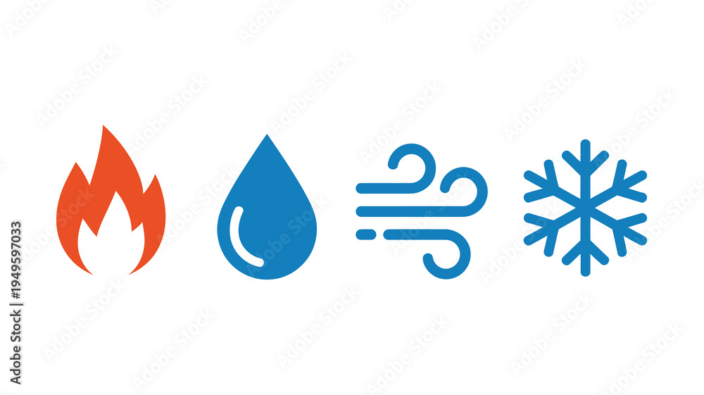 A simple graphic displays four elemental icons fire water air and ice each represented by a distinct colorful symbol high quality professional detailed modern elegant stylish #1949597033