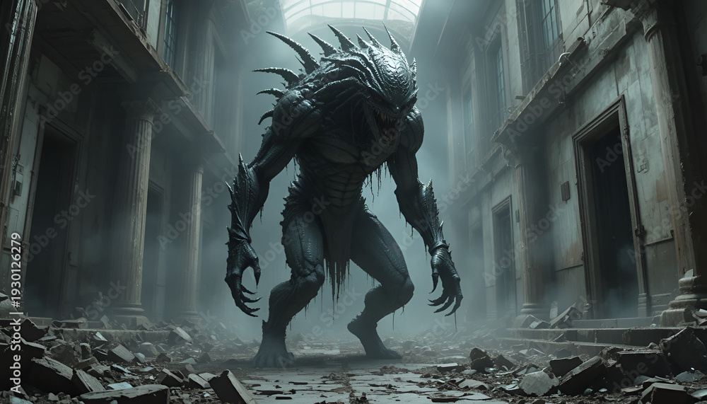 A terrifying monster stands amidst the ruins of a destroyed building #1930126279