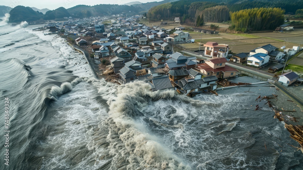 A tsunami hit a small seaside town #748549324