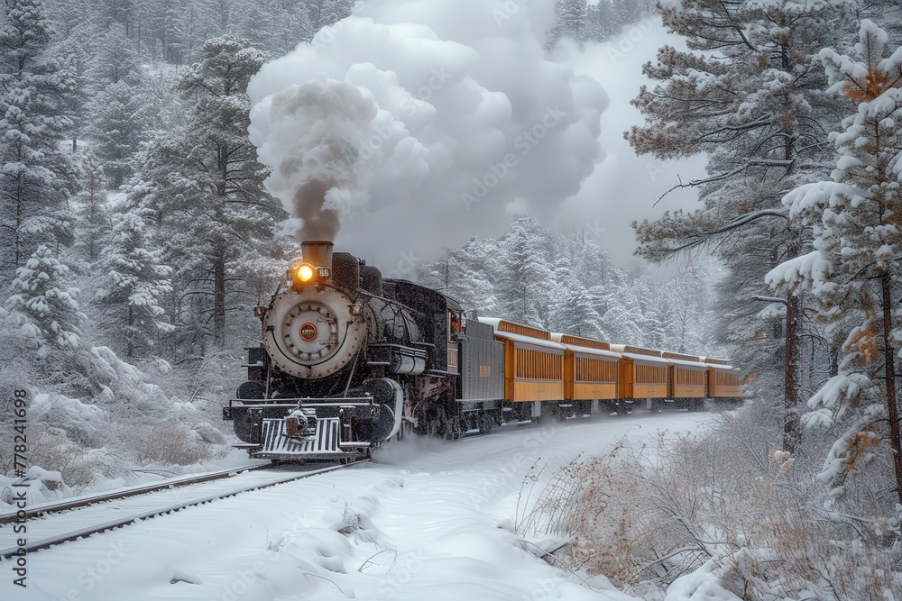 A vintage steam locomotive pulling a passenger train through a snowy winter landscape #778241698